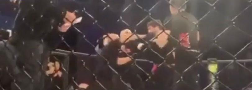 Στο video που κυκλοφόρησε στα social media βλέπουμε ανθρώπους να πηδούν μέσα στο οκτάγωνο και να παίζουν ξύλο με τον διαιτητή, ενώ ο εκφωνητής ακούγεται να φωνάζει να ηρεμήσουν.