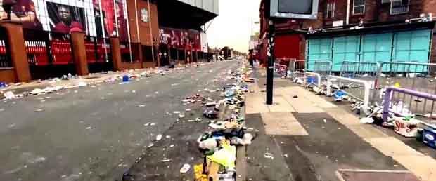 Βομβαρδισμένο τοπίο θύμιζε το πρωί της Παρασκευής (26/6) ο δρόμος έξω από το Άνφιλντ λόγω των ολονύκτιων πανηγυρισμών των οπαδών της Λίβερπουλ για την κατάκτηση του πρωταθλήματος.
