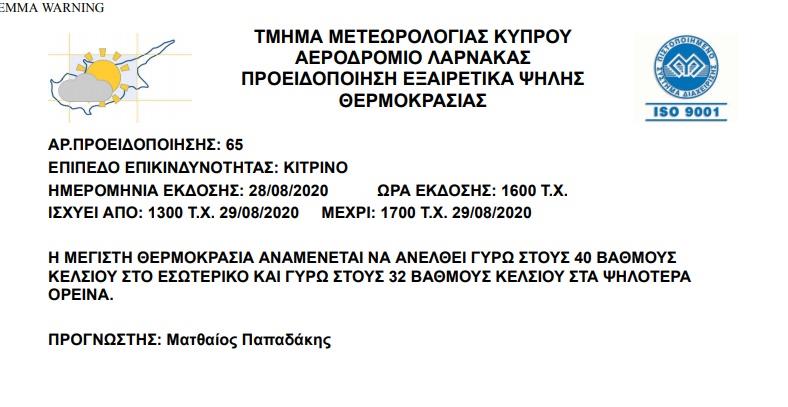 Η Μετεωρολογική Υπηρεσία, εξέδωσε για αύριο κίτρινη προειδοποίηση, αφού η θερμοκρασία θα φθάσει τους 40 βαθμούς Κελσίου.