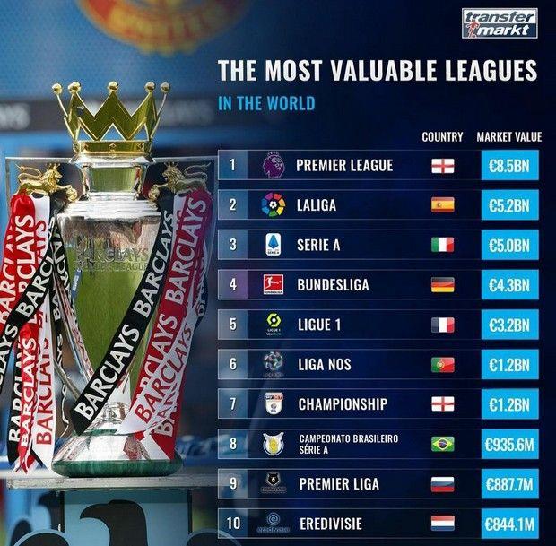 Το TransferMarkt προχώρησε στη δημοσίευση των οικονομικών στοιχείων διαφόρων πρωταθλημάτων ανά τον κόσμο, καταλήγοντας στη διαμόρφωση της κορυφαίας δεκάδας. Η Premier League πρωταγωνιστεί φυσικά και με διαφορά από τη δεύτερη λίγκα, με την αξία του αγγλικού πρωταθλήματος να ανέρχεται στα 8,5 δισεκατομμύρια ευρώ.