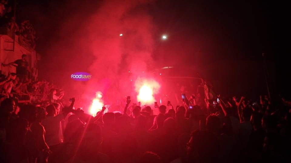 Με πυροτεχνήματα, φωτοβολίδες και συνθήματα έγινε το... έλα να δεις κατά την άφιξη της αποστολής.