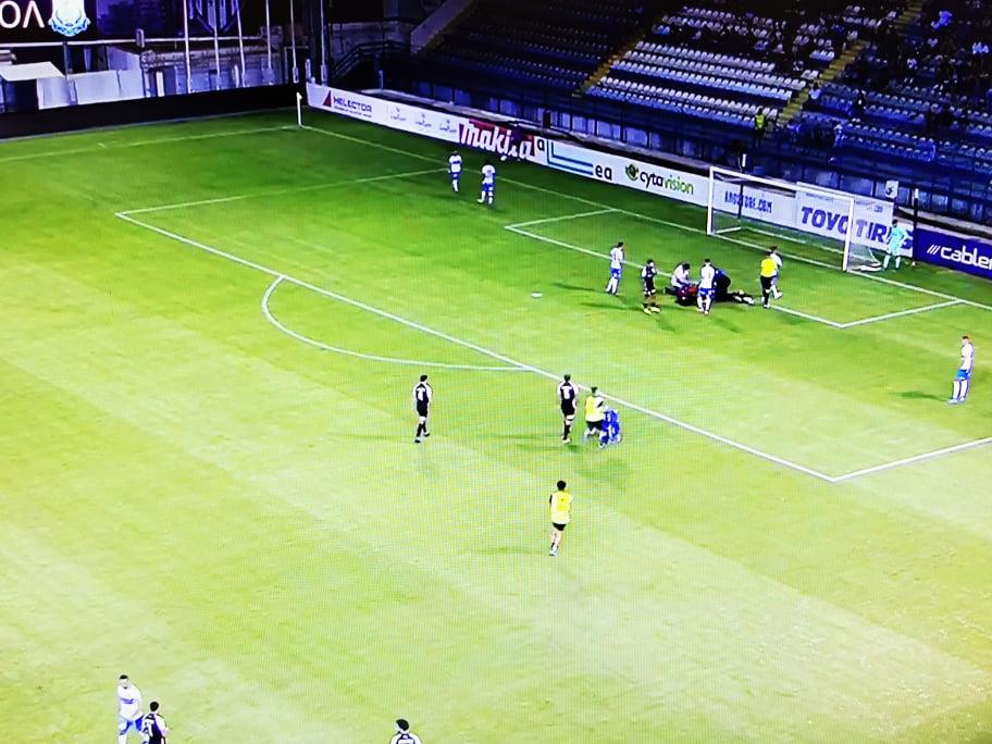 Ο Ελλαδίτης ποδοσφαιριστής της Ανόρθωσης έπιασε κεφαλιά στο 42ο λεπτό της αναμέτρησης, όμως κατά την προσγείωση του χτύπησε στο κεφάλι και σωριάστηκε στο έδαφος.