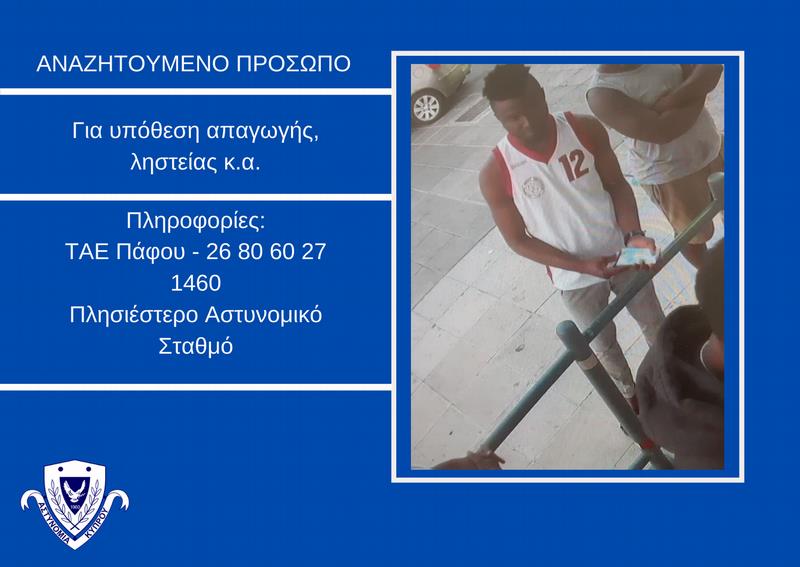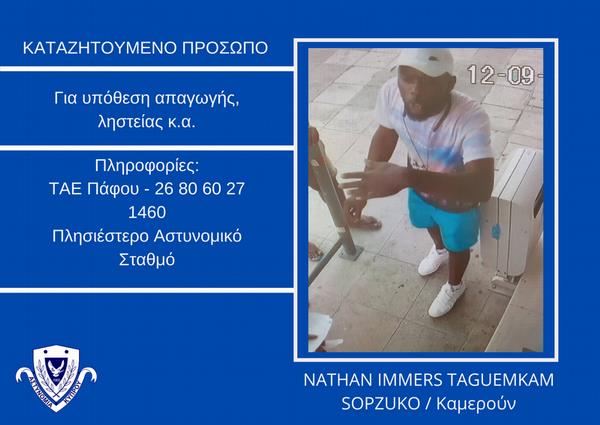 Σύμφωνα με ανακοίνωση της Αστυνομίας «στο πλαίσιο διερεύνησης υπόθεσης συνομωσίας προς διάπραξης κακουργήματος, απαγωγής, ληστείας κ.α., που διαπράχθηκαν στις 12/09/2020 στην επαρχία Πάφου, η Αστυνομία καταζητεί τον NATHAN IMMERS TAGUEMKAM SOPZUKO, 34 ετών από το Καμερούν.
