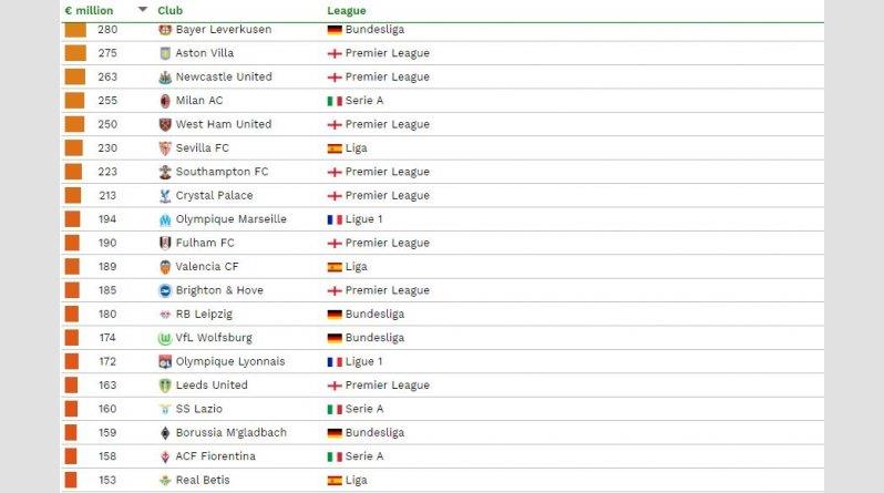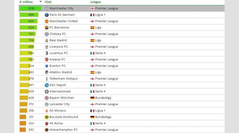 Αξίζει να σημειωθεί ότι η πρωταθλήτρια Ευρώπης, Μπάγερν Μονάχου, βρίσκεται μόλις στην 15η θέση (408 εκατ. ευρώ), κάτω από ομάδες όπως η Νάπολι και η Έβερτον.