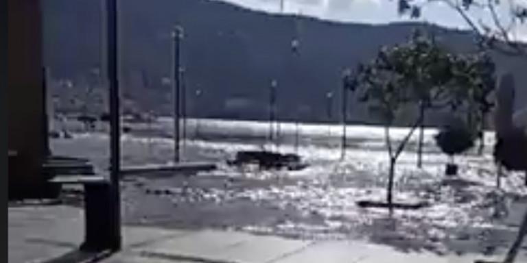 Στο βίντεο που ανέβασε στο facebook κάτοικος του νησιού τα νερά της θάλασσας βγήκαν στη στεριά και πλημμύρισαν τους δρόμους.