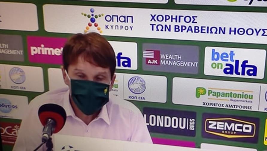 «Συγχαρητήρια στον Απόλλωνα για τη νίκη του. Το πρώτο μέρος ήταν περισσότερο ισορροπημένο και δεχθήκαμε ένα γκολ από μια ενέργεια. Στο δεύτερο ρισκάραμε και παίξαμε επιθετικά για να σκοράραμε. Συνεχίσαμε να ρισκάρουμε και από μια ενέργεια δεχθήκαμε και το δεύτερο γκολ. Έπαιξαν πιο έξυπνα από εμάς. Εκμεταλλευθήκαν πολλές διακοπές στον αγώνα και έτσι πήραν και τη νίκη. Δεν μπορώ να πω ότι φταίει ένας ποδοσφαιριστής συγκεκριμένα. Φταίμε όλοι γι’ αυτό, γιατί ρισκάραμε και πληρώσαμε αυτή μας τη φιλοδοξία και το ρίσκο που πήραμε.