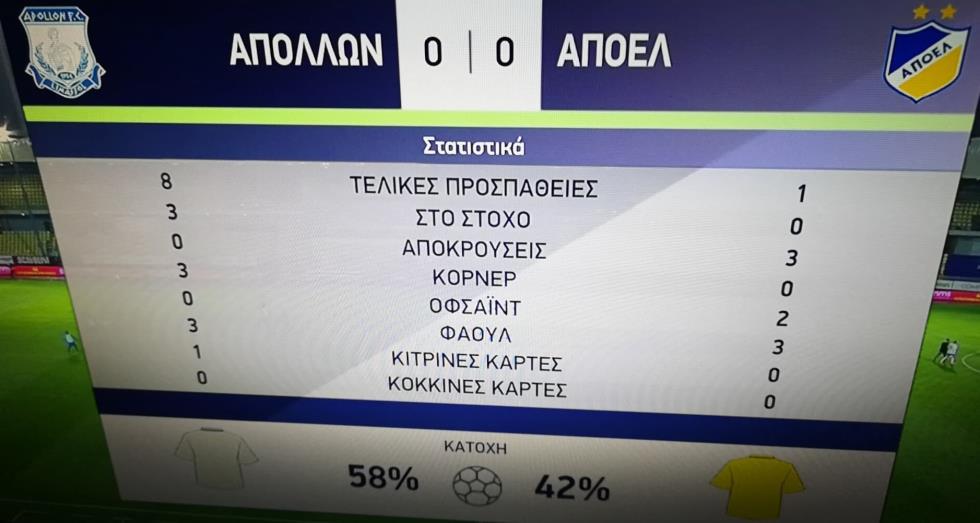 Όπως η γάτα το ποντίκι έπαιξε τον ΑΠΟΕΛ στο πρώτο ημίχρονο ο Απόλλωνας, που έφτιαξε οκτώ ευκαιρίες για να πετύχει κάποιο γκολ, τρεις από τις οποίες κατέληξαν εντός στόχου, όμως δεν βρήκε το δρόμο προς τα δίκτυα.
