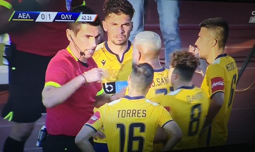 Η απόφαση του διαιτητή έφερε έντονες αντιδράσεις από τον πάγκο της ΑΕΛ.