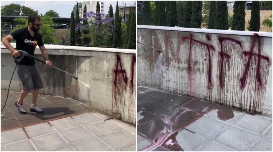 Σύμφωνα με βίντεο που ανήρτησε ο Δήμος Λευκωσίας, μέλη του δήμου ανέλαβαν δράση για να καθαρίσουν τα συνθήματα που έγραψαν με σπρέι οι οπαδοί της Ομόνοιας, οι οποίοι γιόρτασαν την κατάκτηση του τίτλου τρίτης κατηγορίας, στην πλατεία Ελευθερίας.