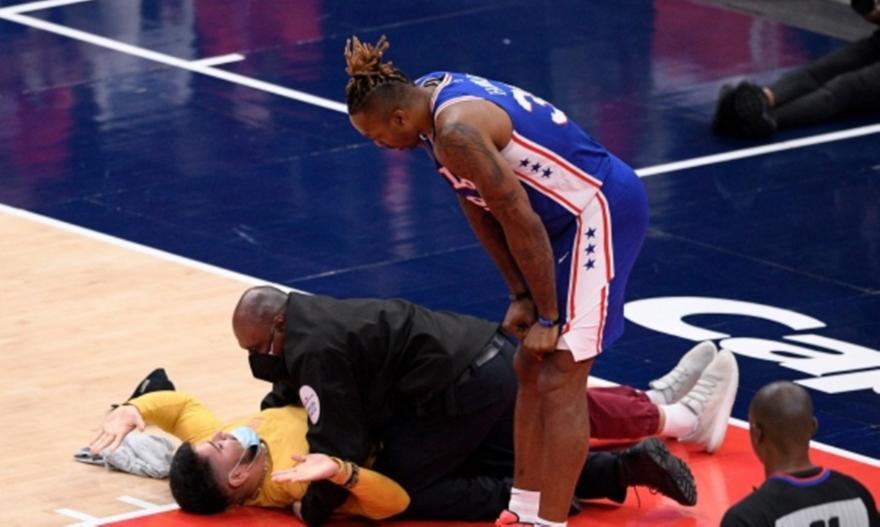 Ένα ασυνήθιστο, για το ΝΒΑ, περιστατικό σημειώθηκε κατά τη διάρκεια του τρίτου δωδεκαλέπτου της αναμέτρησης των Ουάσινγκτον Ουίζαρντς με τους Φιλαδέλφεια 76ερς, καθώς ένας θεατής εισέβαλε στο παρκέ!