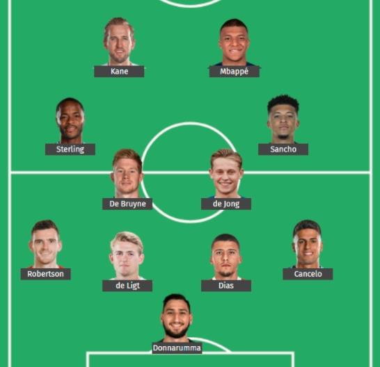 Μεσαία γραμμή: Τζέιντον Σάντσο (Αγγλία, 100 εκατ.), Φρένκι Ντε Γιονγκ (Ολλανδία, 90 εκατ.), Κέβιν Ντε Μπρόινε (Βέλγιο, 100 εκατ.), Ραχίμ Στέρλινγκ (Αγγλία, 90 εκατ.)