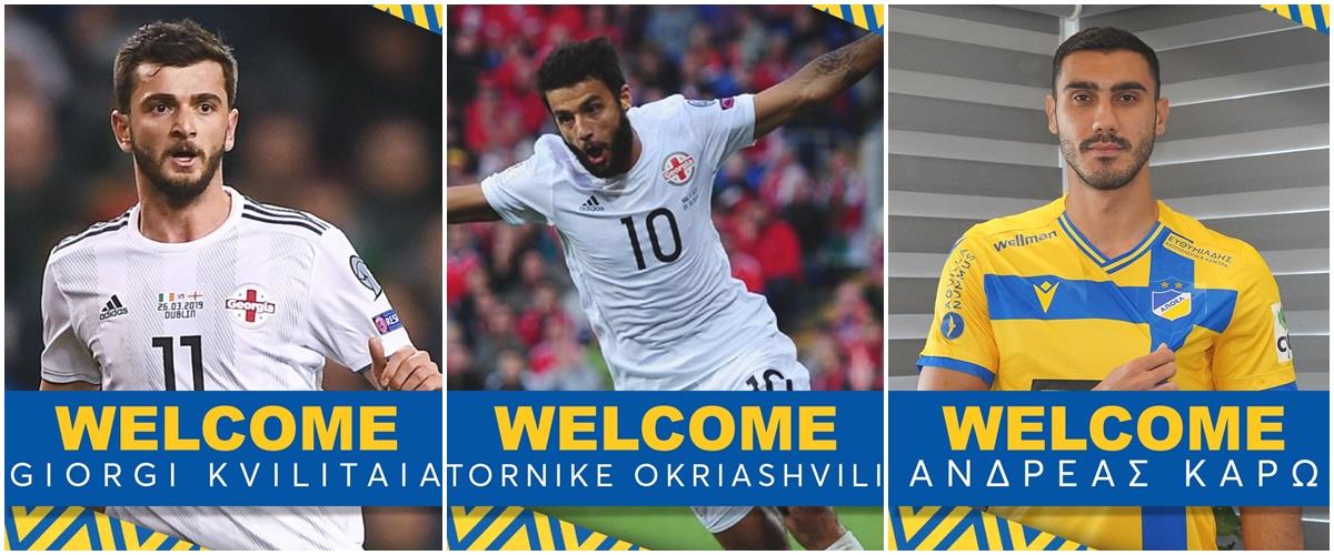 Ανδρέας Καρώ, Tορνίκε Οκριασβίλι, Γκιόργκι Κβιλιτάια, Στέλιος Βρόντης και Σταύρος Γεωργίου, είναι τα φιρμάνια που έσκασαν το τελευταίο διάστημα στους γαλαζοκίτρινους, με τα δυο εξ αυτών μέσα σε μερικές μόνο ώρες, κατάφεραν να σκορπίσουν χαμόγελα στον κόσμο του ΑΠΟΕΛ.
