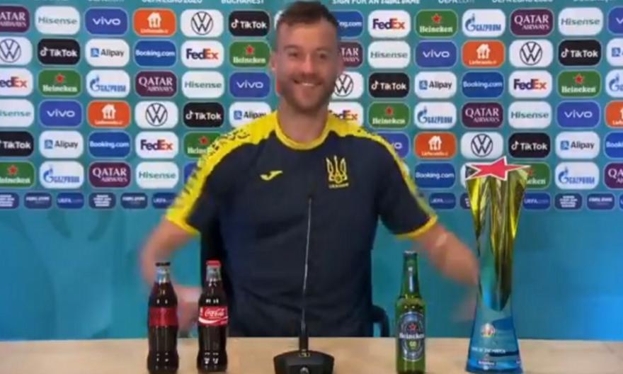 Απόψε, δε, ακολούθησε ο Αντρί Γιαρμολένκο! Ο επιθετικός της Γουέστ Χαμ, που έτυχε το πρώτο γκολ της Ουκρανίας στη νίκη της με σκορ 2-1 επί της Βόρειας Μακεδονίας, τρόλαρε και αυτός τον Κριστιάνο με έναν μοναδικό τρόπο. Μόλις κάθισε και αντίκρυσε το αναψυκτικό και την μπύρ, έφερε μπροστά του τα μπουκάλια και ρώτησε ευγενικά: «Μπορώ να κάνω κάτι; Είδα τον Ρονάλντο να το κάνει αυτό», είπε και έφερε τα μπουκάλια ακριβώς μπροστά του. Τότε, απευθύνομενος προς τα διευθυντικά στελέχη των δύο εταιρειών, δήλωσε ξεσπώντας σε γέλια: «Coca Cola και Heineken, εδώ είμαι, επικοινωνήστε μαζί μου».