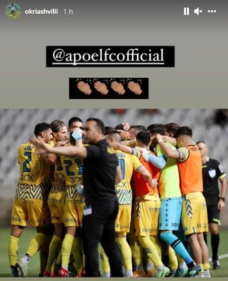 Σε ανάρτηση του ο Οκριασβίλι, δημοσίευσε τη φωτογραφία, στην οποία οι παίκτες του ΑΠΟΕΛ, πανηγύρισαν όλοι μαζί το γκολ του Σαμπάλα και τους... χειροκρότησε.