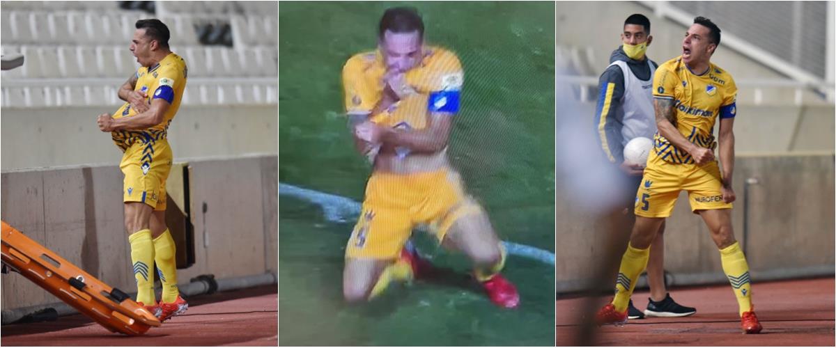 Με την έλευση του γκολ του, ο ίδιος ξέσπασε. Πανηγύρισε με χαρακτηριστικό τρόπο, από τον οποίο από πήγαζε το πάθος. Αμέσως, έτρεξε μπροστά στην Δυτική, έδειχνε και φιλούσε το σήμα του ΑΠΟΕΛ και μάλιστα πριν γονατίσει μπροστά στην κερκίδα το δάγκωσε.