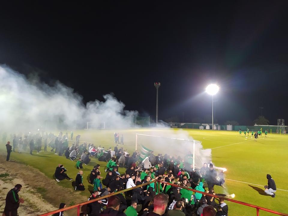 Οι φίλοι των πρασίνων, με συνθήματα και φωτοβολίδες έφτιαξαν ατμόσφαιρα γηπέδου ντοπάροντας τους ποδοσφαιριστές των πρασίνων.