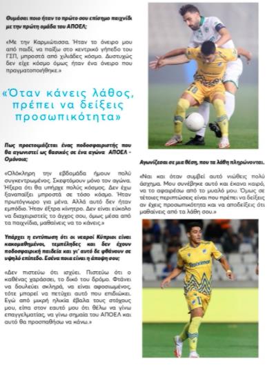 Ο νεαρός άσος των γαλαζοκιτρίνων, αναφέρθηκε, μεταξύ άλλων, για την εμπειρία του ντέρμπι με την Ομόνοια, τον πατέρα του αλλά και τον αγώνα με τη Ρεάλ, σημειώνοντας ότι έβλεπε τον πατέρα του να μαρκάρει τον Κριστιάνο Ρονάλντο.
