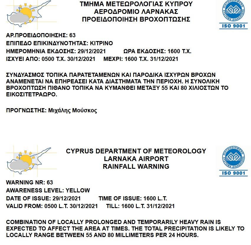 Σύμφωνα με την Μετεωρολογική Υπηρεσία, η κίτρινη προειδοποίηση θα έχει ισχύ από τις 5:00 τα ξημερώματα της Πέμπτης 30 Δεκεμβρίου, μέχρι τις 4:00 το απόγευμα της Παρασκευής 31 Δεκεμβρίου και όπως αναμένεται συνδυασμός τοπικά παρατεταμένων και παροδικά ισχυρών βροχών αναμένεται να επηρεάσει κατά διαστήματα την περιοχή. Η συνολική βροχόπτωση πιθανό τοπικά να κυμανθεί μεταξύ 55 και 80 χιλιοστών το εικοσιτετράωρο.