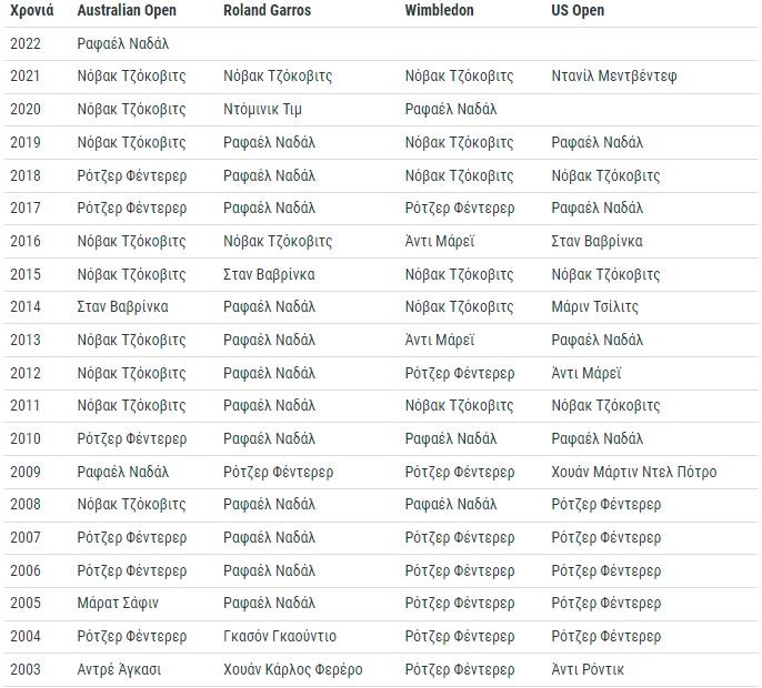 Δείτε τον αναλυτικό πίνακα με τις κατακτήσεις σε Grand Slam όλο αυτό το διάστημα