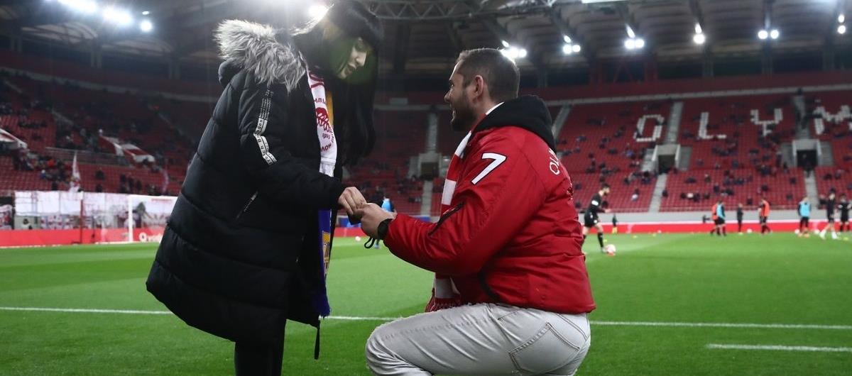 Συγκεκριμένα, ένας φίλος των ερυθρόλευκων αποφάσισε να κάνει πρόταση γάμου στην καλή του στον αγωνιστικό χώρο του φαληρικού γηπέδου, πριν από την έναρξη του παιχνιδιού.