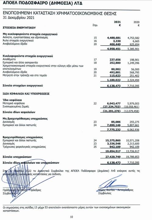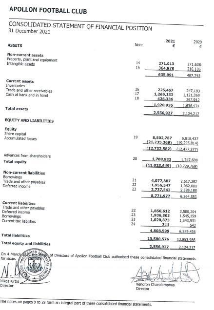 Σύμφωνα με τα στοιχεία, ο ΑΠΟΕΛ συνολικές υποχρεώσεις που ανέρχονται στα €27,429.749. Τα εισοδήματά του τη φετινή χρονιά ήταν μόλις €5,035.614, ενώ τα λειτουργικά έξοδα ανήλθαν σε €13,557,128.