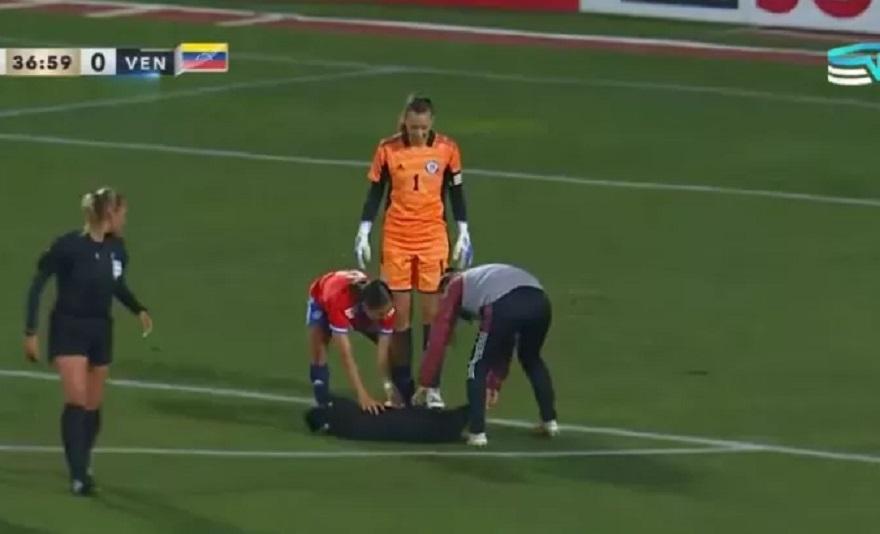 Τις εντυπώσεις έκλεψε στον ποδοσφαιρικό αγώνα γυναικών μεταξύ Χιλής και Βενεζουέλας ένας σκύλος, ο οποίος μπήκε μέσα στο γήπεδο και ζητιάνευε χάδια από τις παίκτριες.