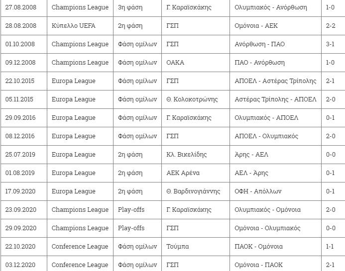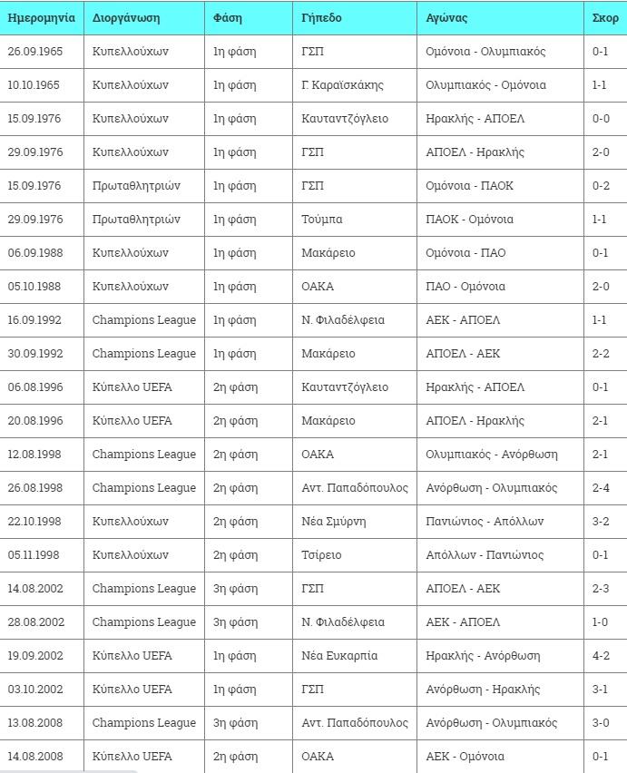Αναλυτικά οι 37 αγώνες μεταξύ Κύπρου - Ελλάδας στα Κύπελλα Ευρώπης: