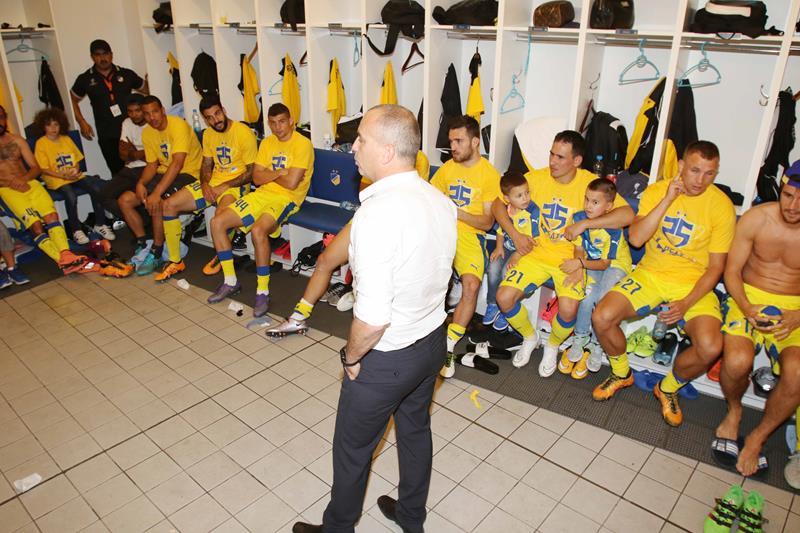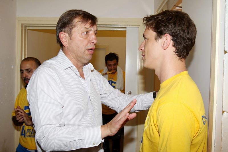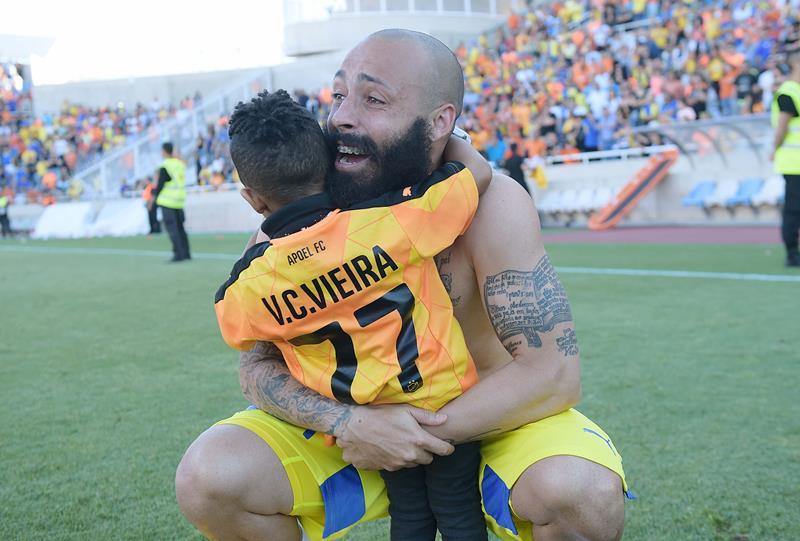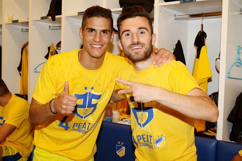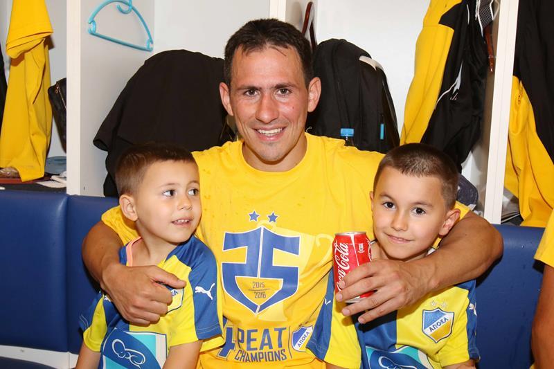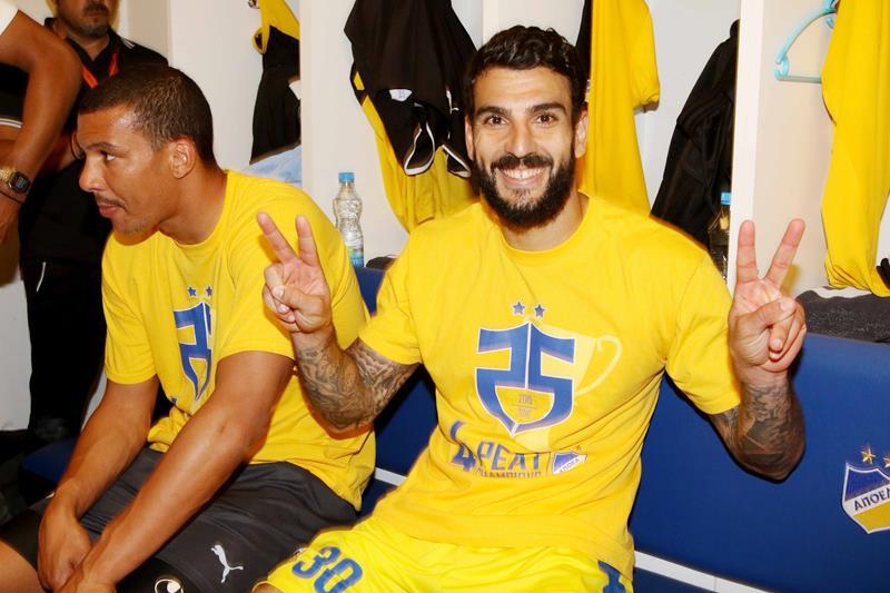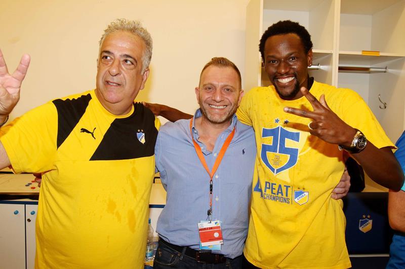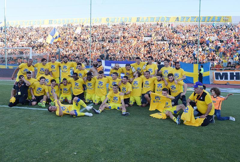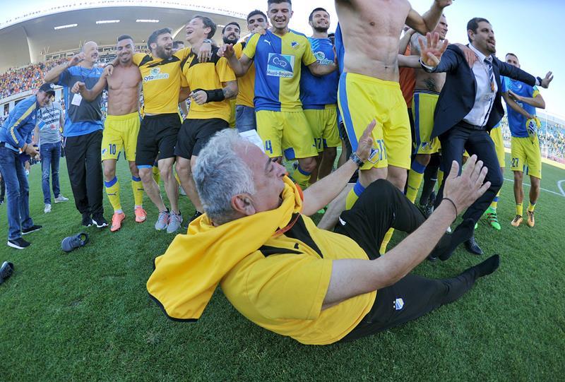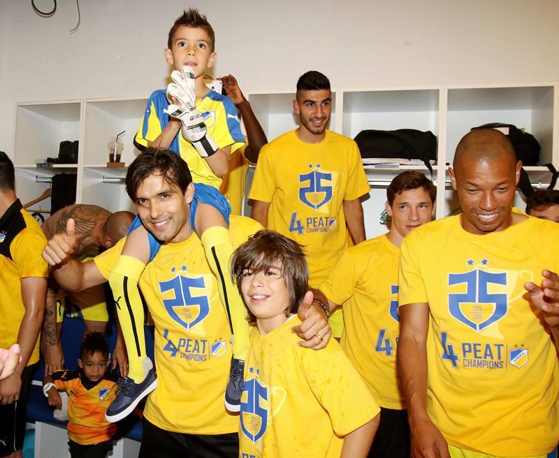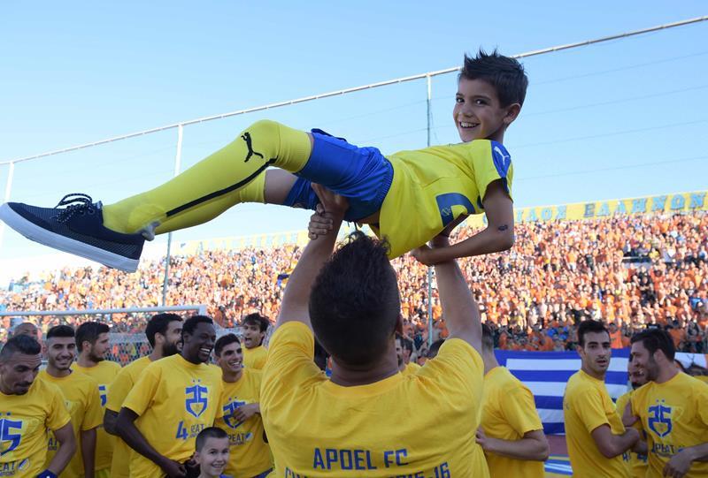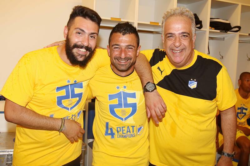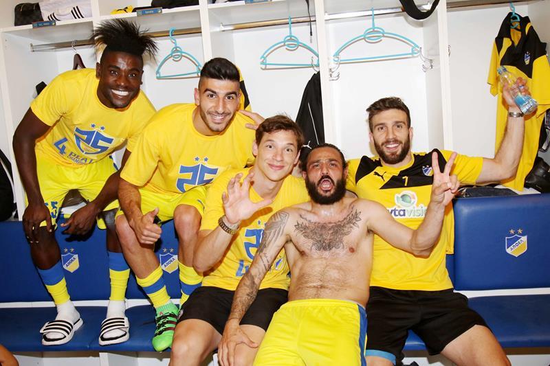 Τρελό πανηγύρι έστησαν οι ποδοσφαιριστές, τεχνικό επιτελείο και διοίκηση του ΑΠΟΕΛ αμέσως μετά το τέλος του αγώνα με την ΑΕΚ που έχρισε και επίσημα πρωταθλητές τους γαλαζοκίτρινους, δύο αγωνιστικές πριν από τη λήξη της σεζόν.