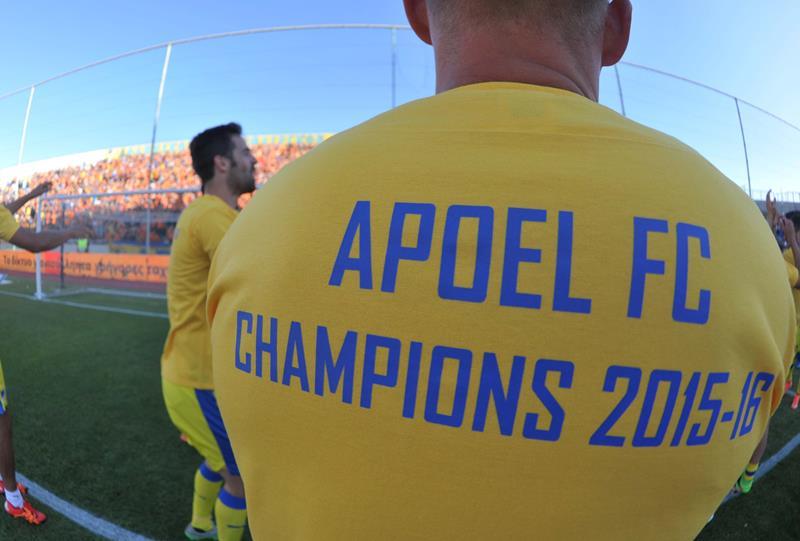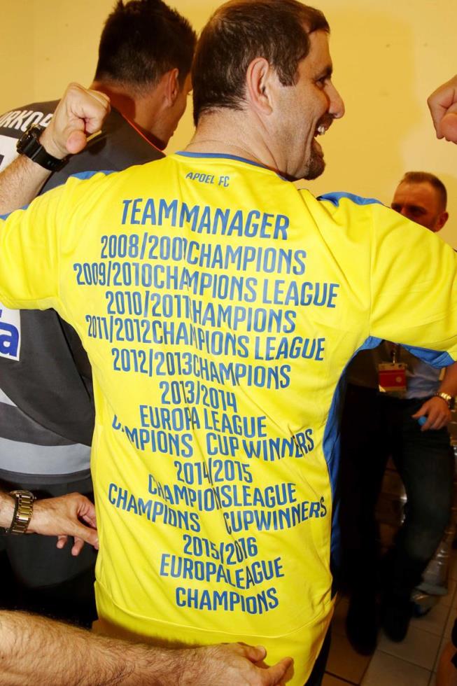 Μετά τις αγκαλιές και τις ομαδικές φωτογραφίες, οι ποδοσφαιριστές παρέλαβαν και φόρεσαν φανέλες που ανάγραφε «APOEL FC Champions 2015-16», ενώ στην μπροστινή πλευρά ήταν αναγραμμένο ο 25ος τίτλος και τονιζόταν το τέταρτο συνεχόμενο.