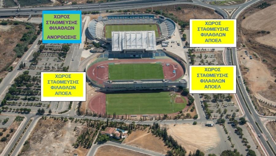 Οι φίλαθλοι του ΑΠΟΕΛ θα καταλάβουν τις Δυτικές, Ανατολικές και Νότιες κερκίδες του Σταδίου, ως εκ τούτου, προτρέπονται να κατευθυνθούν στο Στάδιο μέσω του κυκλικού κόμβου του Γ.Σ.Π. και της Λεωφόρου Ανεξαρτησίας. Να σταθμεύσουν τα οχήματα τους στον Δυτικό και Νότιο χώρο στάθμευσης οχημάτων.
