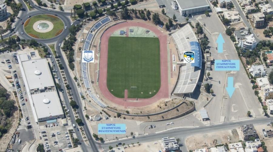 Οι φίλαθλοι της ομάδας της Πάφος F.C θα καταλάβουν τις δυτικές κερκίδες του σταδίου. Ως εκ τούτου, προτρέπονται οι οπαδοί που θα εισέλθουν στις πιο πάνω κερκίδες να σταθμεύσουν τα οχήματα τους στον δυτικό χώρο στάθμευσης.