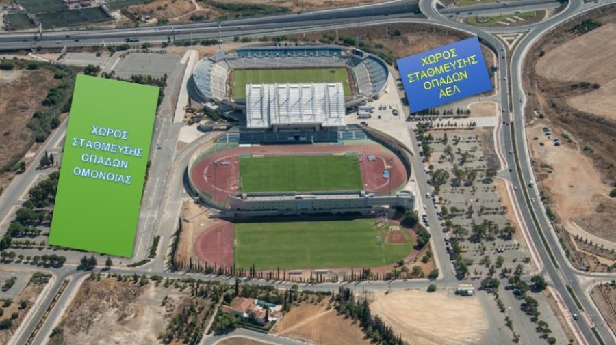 Οι φίλαθλοι της ΟΜΟΝΟΙΑΣ θα καταλάβουν τις δυτικές, βόρειες και ανατολικές κερκίδες του σταδίου, ως εκ τούτου, προτρέπονται να κατευθυνθούν στο στάδιο μέσω της λεωφόρου Σπύρου Κυπριανού και των φώτων τροχαίας Ορφανίδη και να σταθμεύσουν τα οχήματα τους στον δυτικό και στον βόρειο χώρο στάθμευσης οχημάτων.