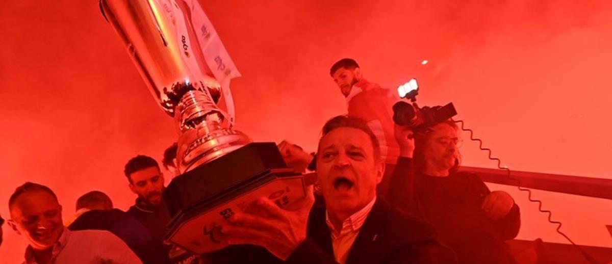 Ο πρόεδρος του ΑΠΟΕΛ ανέβηκε στον εξώστη του σωματείου του, σήκωσε το τρόπαιο και πανηγύρισε μαζί με τους ποδοσφαιριστές και τον κόσμο.