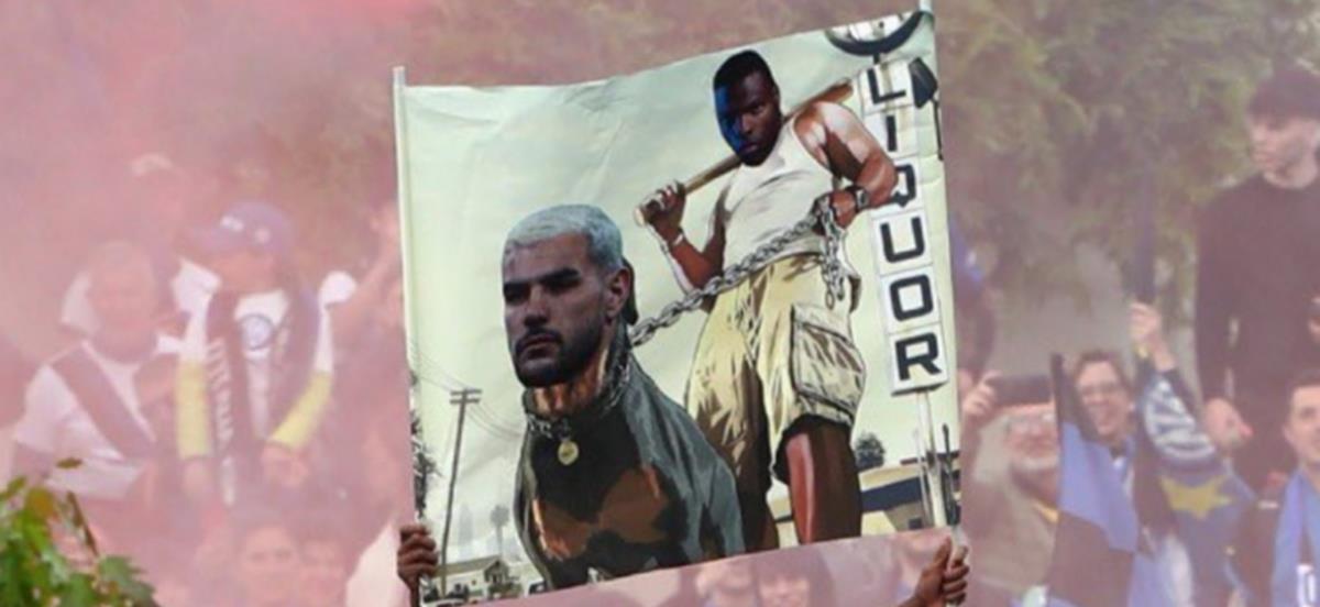 Αυτό το έκανε σηκώνοντας ένα πλακάτ που απεικόνιζε τον ίδιο να κρατάει με λουρί τον ποδοσφαιριστή της Μίλαν, που έπαιζε το ρόλο ενός σκύλου, με τους οπαδούς να παραληρούν στη θέα του Ολλανδού φουλ μπακ αλλά τους ουδέτερους να κάνουν λόγο για unfair κίνηση που αναμένεται να επιφέρει πρόστιμο στον παίκτη.