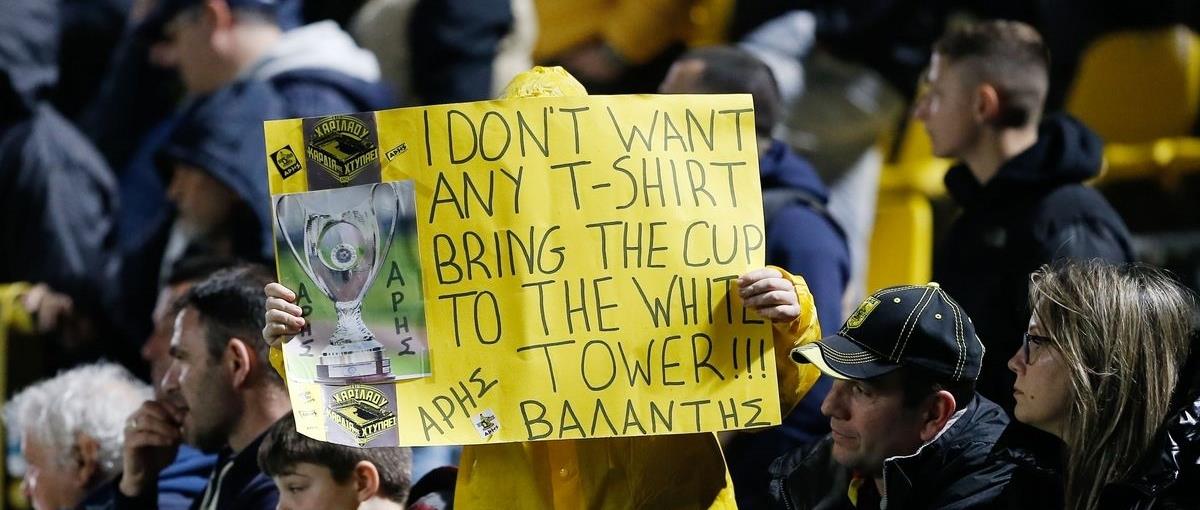 Συγκεκριμένα, ο φωτογραφικός φακός τον συνέλαβε στο Κλεάνθης Βικελίδης στο ματς απέναντι στον Βόλο να κρατάει ένα πλακάτ, το οποίο έγραφε: "Δεν θέλω κάποια φανέλα, φέρτε το Κύπελλο στον Λευκό Πύργο".