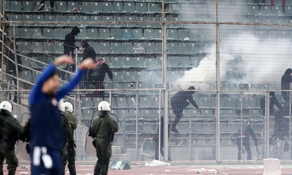 Αρκετοί αστυνομικοί παρατάχθηκαν μπροστά από τους πάγκους, ενώ φίλαθλοι που δεν συμμετείχαν στα επεισόδια αποχώρησαν από τις κερκίδες τους.
