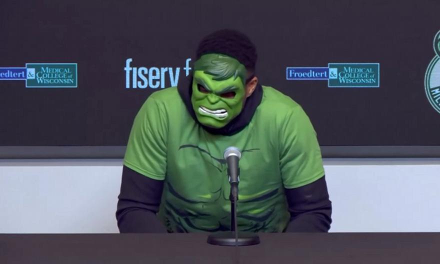 Ο Γιάννης Αντετοκούνμπο πήγε στο γήπεδο ως Hulk λόγω Halloween και μετά τη νίκη των Μπακς επί των Χιτ (122-114) με τη δική του πολύ καλή εμφάνιση, πήγε με την ίδια αμφίεση και στη συνέντευξη Τύπου.