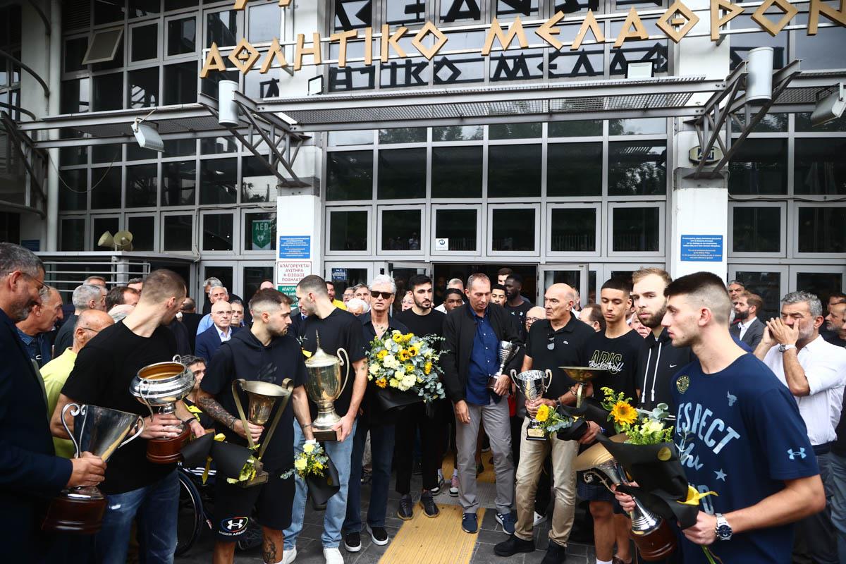 Στο μεταξύ, η ομάδα μπάσκετ του Άρη, μετά την άφιξη του φερέτρου, σήκωσε τα κύπελλα που έχει κατακτήσει ο Γιάννης Ιωαννίδης με την ομάδα και στη συνέχεια άφησαν λουλούδια πάνω στο φέρετρο.