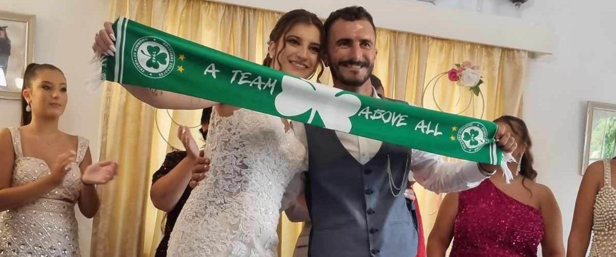 Ο αδελφός της νύφης, Χρίστος, δεν δίστασε μάλιστα να ποζάρει με την αδελφή του με το κασκόλ της αγαπημένης τους ομάδας.