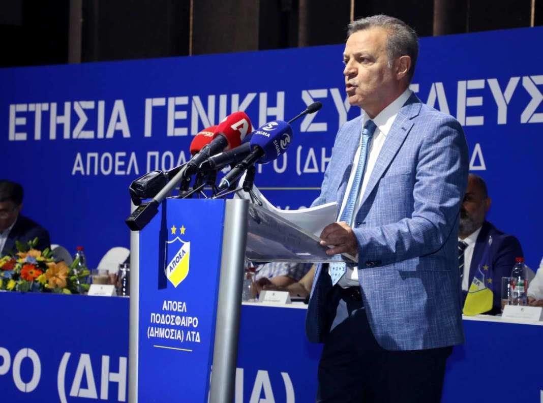 «Τις τελευταίες μέρες έχουν ειπωθεί διάφορα περι Σωματείου και Εταιρείας κι αυτό δεν κάνει τίποτε άλλο από το να βλάπτει το σύνολο του ΑΠΟΕΛ. Θέλω να διευκρινίσω κάποια πράγματα. Την τελευταία διετία τριετία με το Συμβούλιο του Σωματείου, όπως και προηγουμένως (αν εξαιρέσουμε κάποιες μεμονωμένες περιπτώσεις) έχουμε άριστη συνεργασία και πλήρη κατανόηση. Ναι δεν υλοποιήσαμε τις υποχρεώσεις μας των τριών χρόνων που οφείλαμε στο Σωματείο, άλλα δεν επιτρέπω σε κανένα να λέει ότι δώσαμε παλιοχάρτα, επιταγές που ήρθαν πίσω ή δεν δώσαμε τίποτα Είναι εδώ ο πρόεδρος του Σωματείου και της  Διοίκησης που μπορούν να σας επιβεβαιώσουν. Τα τρία χρόνια είχαμε να δώσουμε 900 χιλιάδες στο σωματείο βάσει της συμφωνίας. Μπορεί οποιοσδήποτε να ελέγξει, και ο πρόεδρος του Σωματείου να επιβεβαιώσει. Έχουμε πληρώσει από τις 900 τις 477 χιλιάδες. Από του χρόνου ένα ποσό από τα εισιτήρια διαρκείας θα πηγαίνει απευθείας στο Σωματείο για να μην υπάρχει καθυστέρηση πληρωμών».