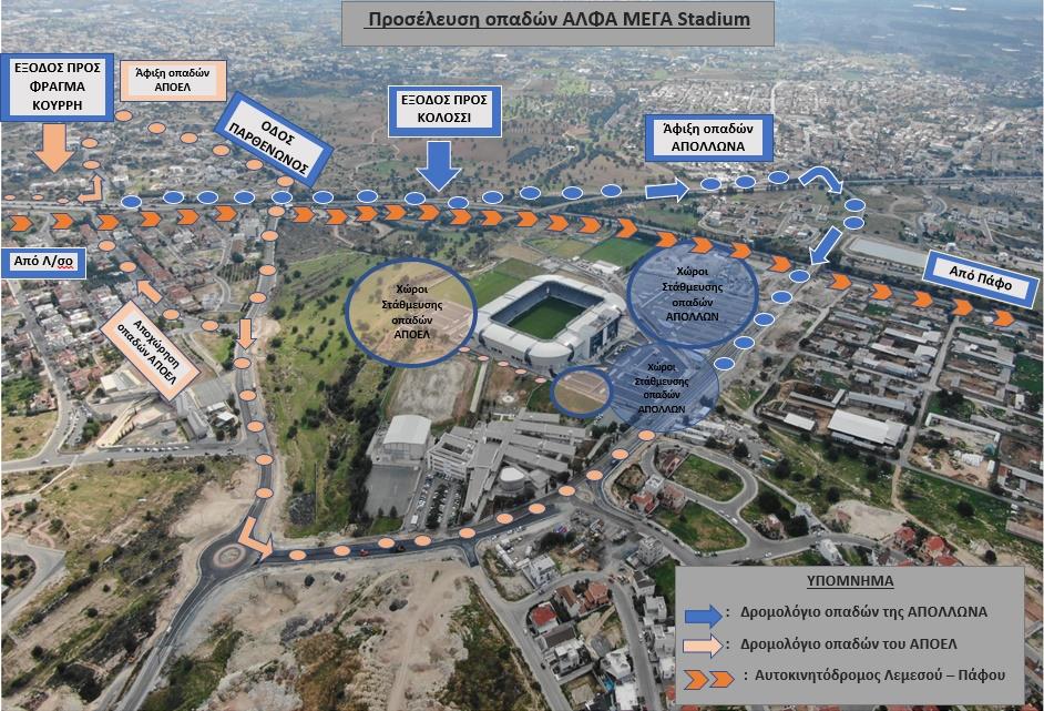 Για την ομαλή προσέλευση και αποχώρηση των οπαδών του ΑΠΟΛΛΩΝΑ προς και από το στάδιο, καλούνται να κατευθυνθούν προς ΑΛΦΑΜΕΓΑ Stadium, δια μέσου του αυτοκινητόδρομου προς Πάφο, έξοδο προς Κολόσσι και ακολούθως δια μέσου της αερογέφυρας, στροφή δεξιά προς το γήπεδο. Οι φίλοι του ΑΠΟΛΛΩΝΑ μπορούν να σταθμεύσουν στους προκαθορισμένους χώρους στάθμευσης του γηπέδου