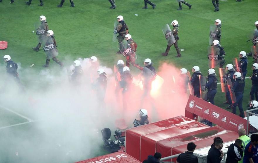 Ο ρέφερι του αγώνα όπως και οι παρευρισκόμενοι στο τερέν τράπηκαν σε φυγή, βλέποντας τους φίλους των Πειραιωτών να συγκρούονται με τα ΜΑΤ.