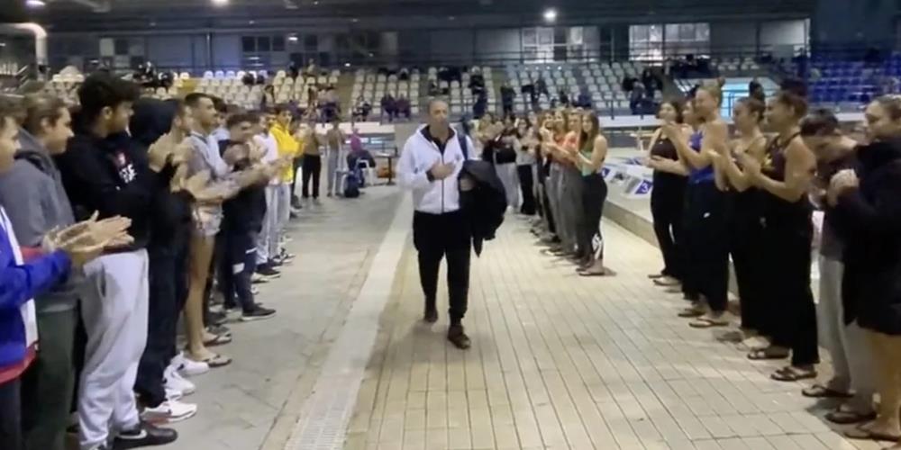 Οι αθλητές των ακαδημιών του ΠΑΟΚ υποδέχθηκαν στο «Ποσειδώνιο» κολυμβητήριο με το πιο ζεστό τους χειροκρότημα τον προπονητή της εφηβικής ομάδας πόλο του ΠΑΟΚ, Γιάννη Παπαγιαννάκη, έναν από τους ηρωικούς διασώστες της ΕΜΑΚ που βρέθηκαν στα Τέμπη.