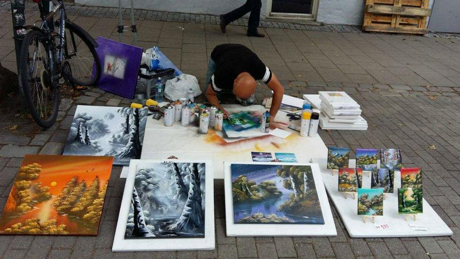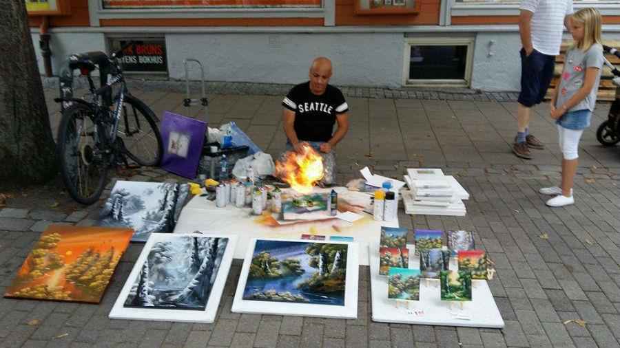 Από την περιδιάβασή μας στην πλατεία ξεχωρίσαμε και την προσπάθεια ενός ζωγράφου που με την βοήθεια σπρέι, βαμβακιού και ενός αναπτήρα φτιάχνει πανέμορφους πίνακες.
